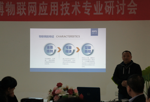 參加本次研討會的學(xué)校嘉賓有:荊州職業(yè)技術(shù)學(xué)院副院長方風(fēng)波、教務(wù)處處長詹永東、校企合作與就業(yè)處處長湯欽林、國際信息技術(shù)學(xué)院常務(wù)副院長蔡波以及信息技術(shù)系專業(yè)教師;湖北國土資源職業(yè)學(xué)院副院長周從軍、信息技術(shù)系主任管勝波、信息技術(shù)系書記馮越;黃岡職業(yè)技術(shù)學(xué)院電子信息工程學(xué)院院長羅幼平、物聯(lián)網(wǎng)教研室主任李敏;湖北三峽職業(yè)技術(shù)學(xué)院電子信息工程學(xué)院院長李建利、電子信息工程學(xué)院副院長秦工、電子信息工程學(xué)院專業(yè)教師鄒志龍;武漢厚溥教育科技有限公司副總經(jīng)理黎祝明、技術(shù)總監(jiān)翁高飛、物聯(lián)網(wǎng)專業(yè)負責(zé)人李杰、專業(yè)研究員涂建以及各合作學(xué)校的學(xué)術(shù)經(jīng)理、物聯(lián)網(wǎng)專業(yè)老師等。