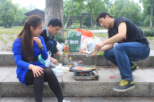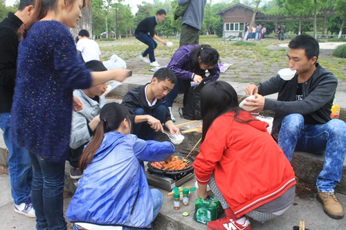 大家圍在一起吃燒烤,很愜意!